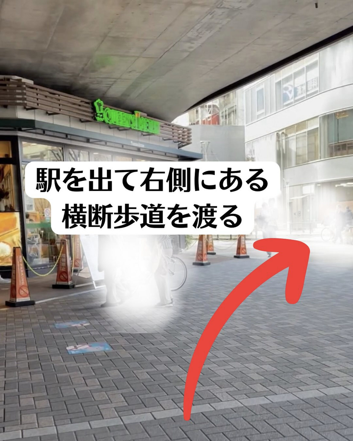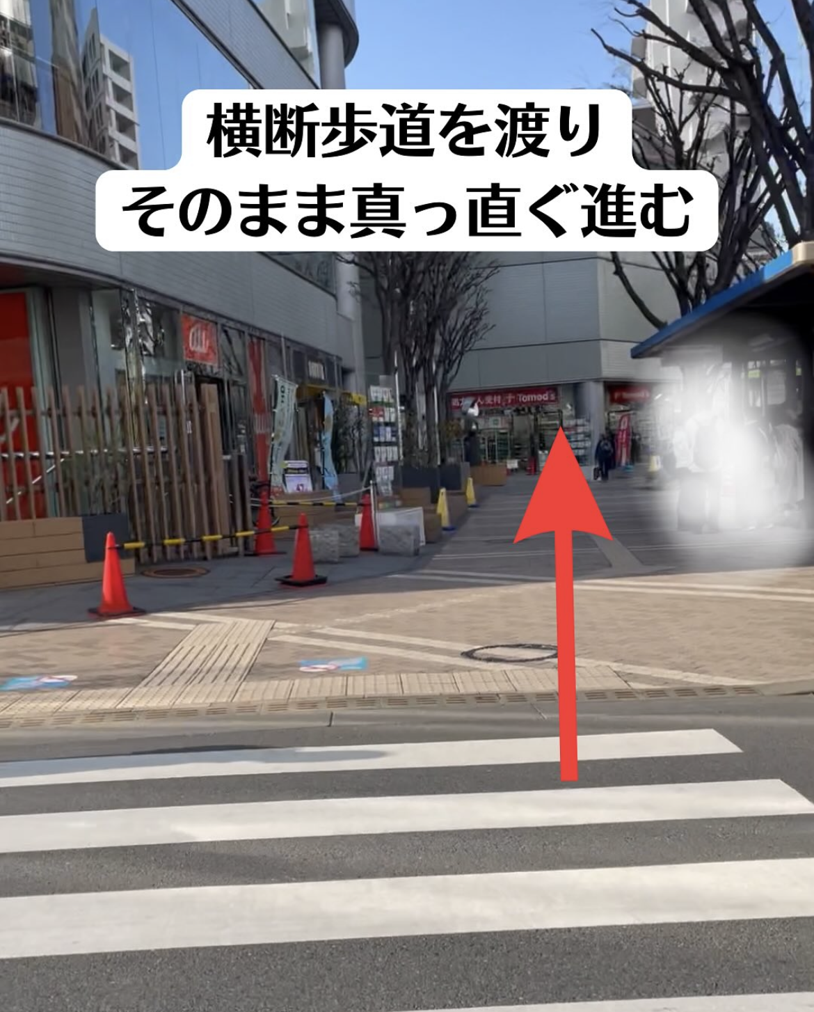 2横断歩道を渡り、まっすぐ進む