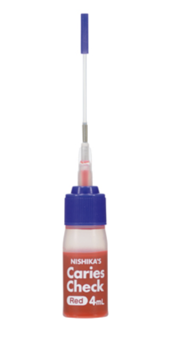 虫歯になっている部分を削り取り、その後に検知液を歯に塗ると、まだ残っている虫歯の部分だけが赤く染まります。